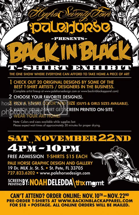 Don't forget that the Back in Black show in St.Pete is this Saturday at the Pale Horse Gallery. You can already order your shirts via online but that ends on Saturday so get on it if you haven't already! There is gonna be a ton of amazing talented artists in the exhibit.