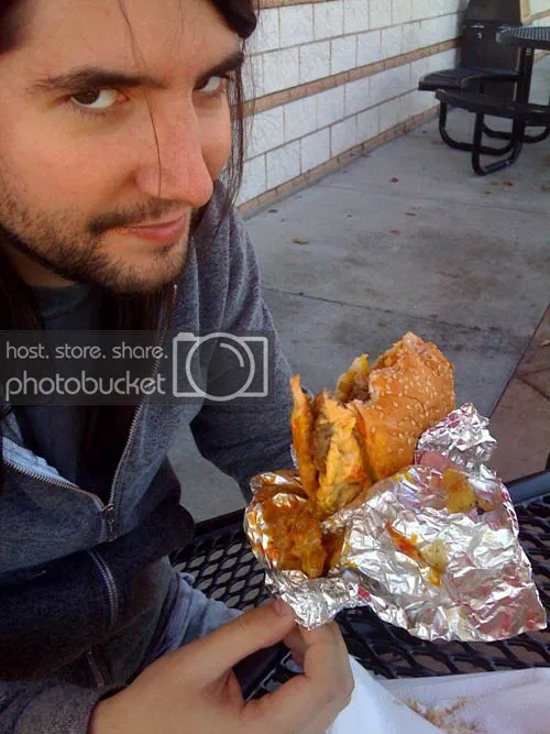 Joey solved the messy problem by shoving the whole burger in his gullet. I thought he was gonna eat his fingers thinking they were french fries.
